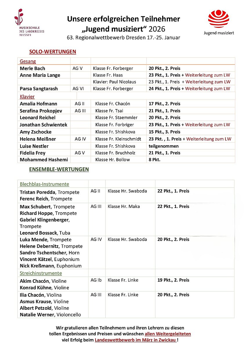 Wir gratulieren allen Teilnehmerinnen und Teilnehmern, sowie ihren Lehrerinnen und Lehrern herzlich zu den großartigen Ergebnissen und Preisen beim 63. Regionalwettbewerb „Jugend musiziert“ Dresden. Mit viel Engagement, sowie hoher künstlerischer Qualität haben unsere Schülerinnen und Schüler eindrucksvolle Leistungen gezeigt und das Publikum begeistert.
