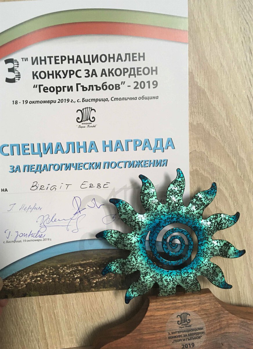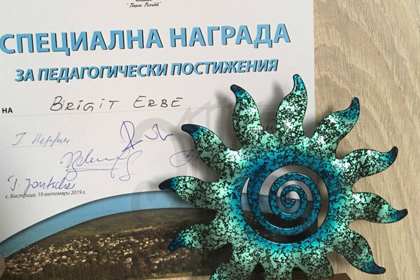 Eine große Ehrung wurde der Lehrerin-Frau Birgit Erbe- zuteil. Nach der Initiatorin Frau Jontschewa wurde sie als 2. erfolgreichste Pädagogin des Wettbewerbs 2019 mit einer Auszeichnung und einem Pokal überrascht und als Jurorin zum nächsten Wettbewerb 2021 eingeladen.
