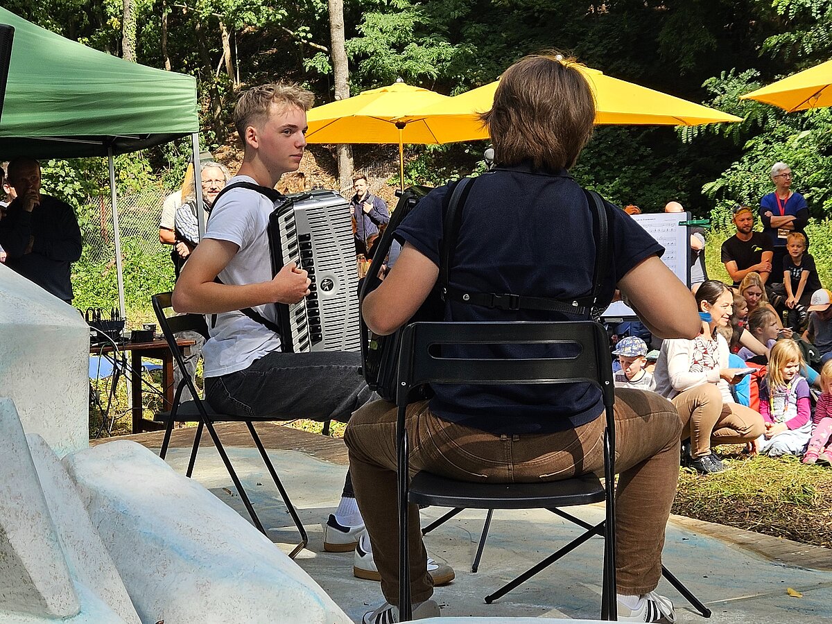 Zum Auftakt dieser Veranstaltung der Landesbühnen Sachsen begrüßten ein mutiger Solohornist, Geigenschüler und ein Akkordeonduo der Musikschule die Gäste mit einem schönen Platzkonzert.
