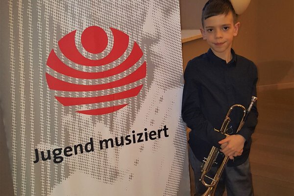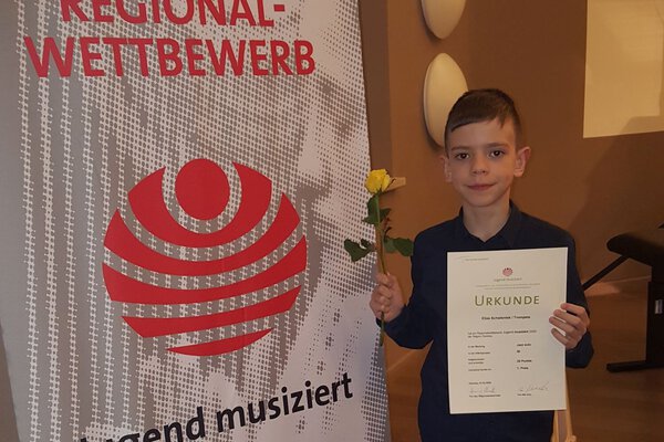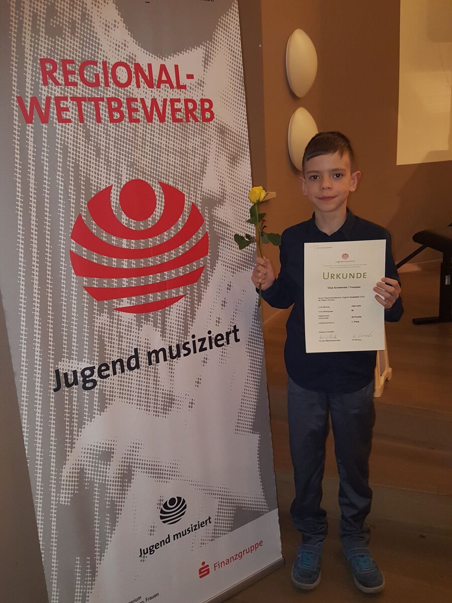 Mit 25 von 25 möglichen Punkten vertrat er den Musikschulbezirk Riesa in der Altersgruppe Ib und wurde von der Fachjury neben sicherem Spiel auf der Trompete auch für seine Improvisation gelobt. Besonders die Interaktion mit der Band und das nutzen spieltechnischer Effekte wie Flatterzunge und Dämpfer für tonliche Effekte fand positiven Anklang. Daher gratulieren wir ganz herzlich Elias Schwientek und der begleitenden Band um Remus Michel und Timon Korn unter der Leitung und Mitwirkung unserer Lehrer Herrn Groß (Band/Gitarre) und Herrn Kuhn (Trompete).